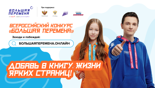 "Большая перемена" – твой шанс проявить себя! Приглашаем школьников 1–10 классов и студентов принять участие во Всероссийском конкурсе "Большая перемена"! Что ждёт участников? - Увлекательные задания - Возможность раскрыть свои таланты - Крутые призы: путешествия, денежные гранты, стажировки и многое другое! - Новые друзья и незабываемые впечатления Как участвовать? Регистрируйся на сайте bolshayaperemena.online, выполняй задания и покажи, на что ты способен! ... Читать дальше »